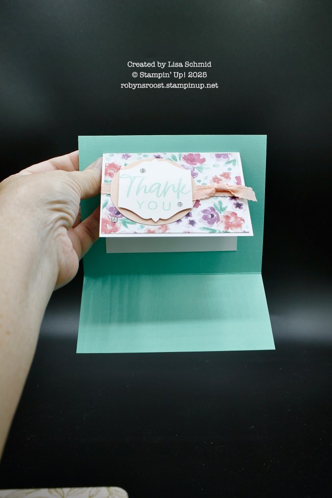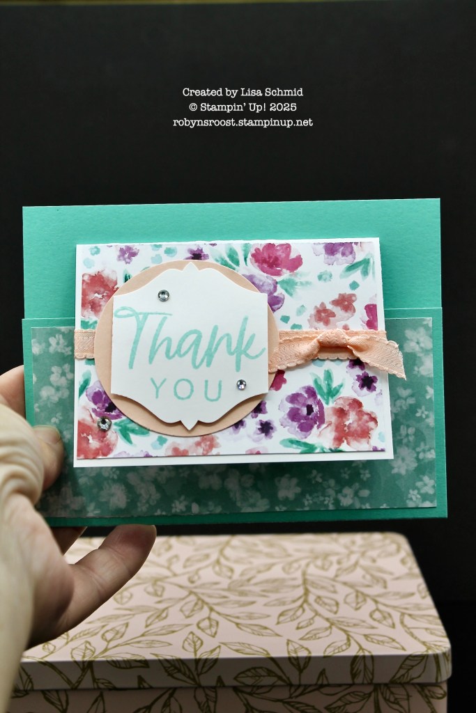 This card by Lisa Schmid starts with a 7″ x 5 1/2″ base scored at 4 1/4″, then a 4″ x 6″ (scored at 3″) note card is centered on the base. The big thank you greeting comes from the With You In Mind stamp set and the To the Point Punch was used to cut it out. It’s then layered onto a 2 3/8″ circle which was done with the 2 3/8″ Circle Punch. the ribbon is wrapped around and a separate knot is added with a glue dot.