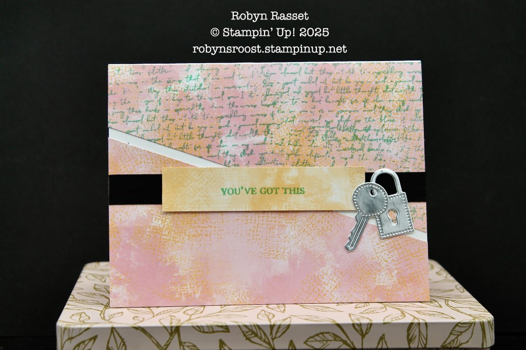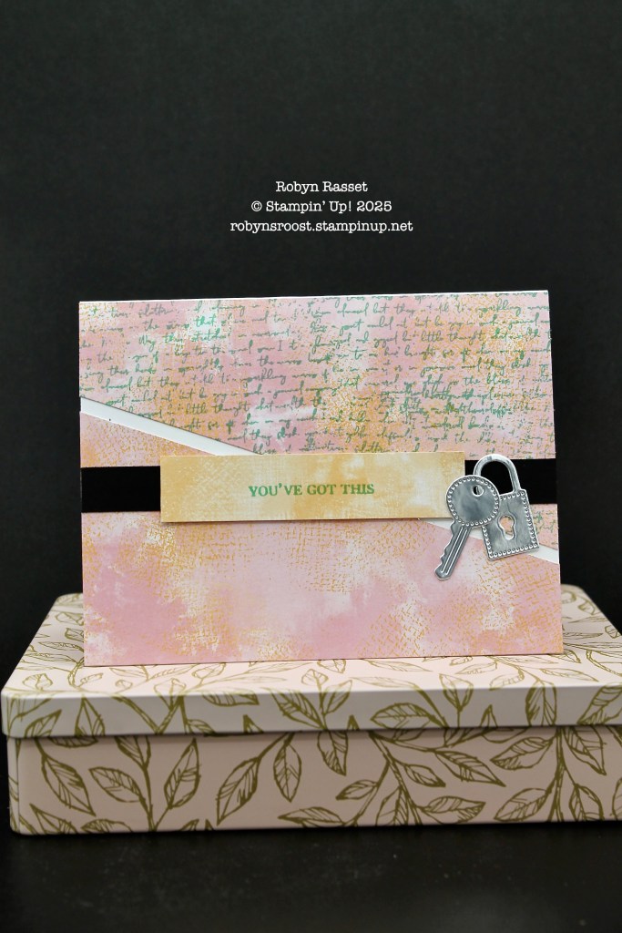 Rather than using ribbon, a 1/2″ x 5 1/2″ strip of black paper was placed under the greeting. The greeting is stamped on another pattern of the Unbounded Beauty DSP, again with Shy Shamrock ink. The greeting layer is 3/4″ x 3 1/2″. The silver foil lock & key are from a new Online Exclusive which will be available in March. It’s called Tags to Go, so watch for it.