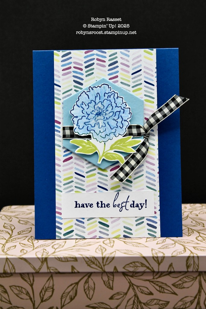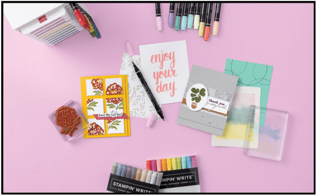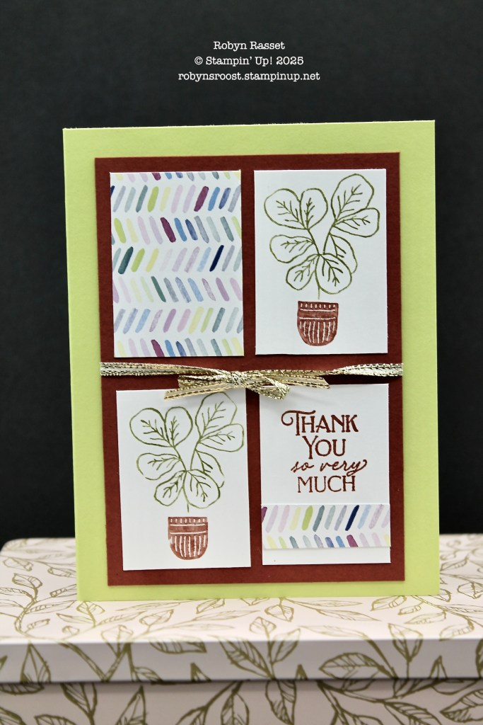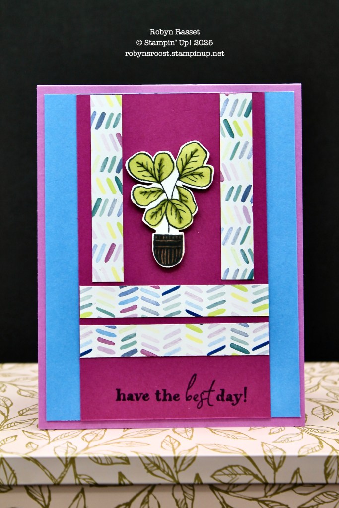 The flower pots on this card are from the exclusive Handmade Designs stamp set as well, and they are inked using Stampin’ Write Markers. Simply use the brush end of the marker and color onto the stamp.
