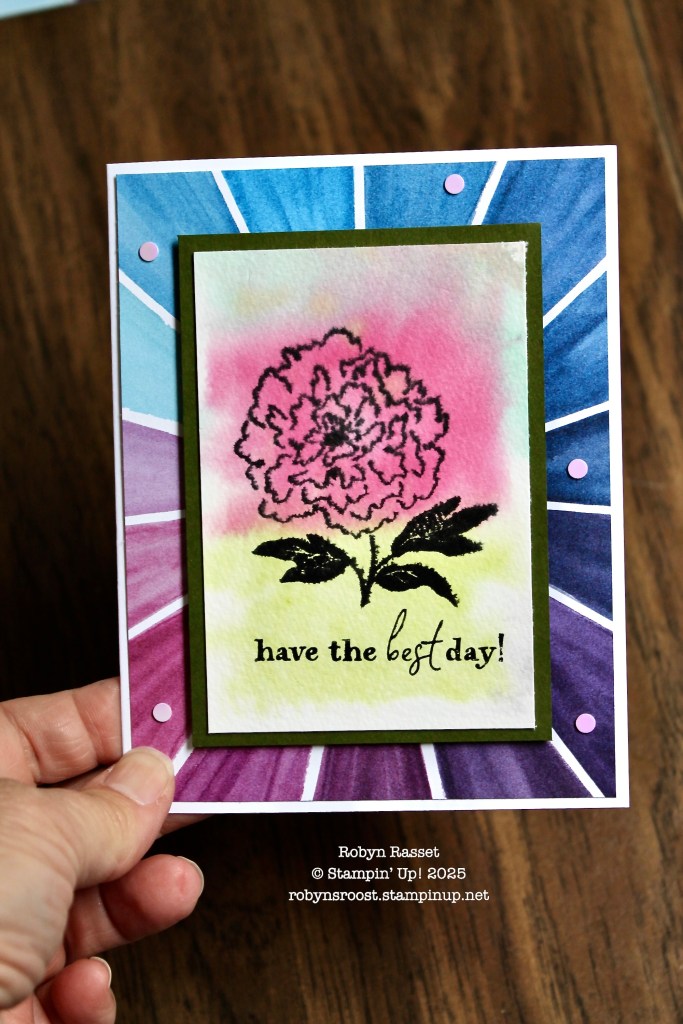 This card uses the Handmade Designs stamp set and a watercolor background created with some markers from the Brights Stampin’ Write Marker set. To create the background scribble ink onto a clear block with the markers, spritz with water and press onto a piece of Fluid 100 Watercolor Paper which was lightly spritzed with water. Let dray and stamp the image.