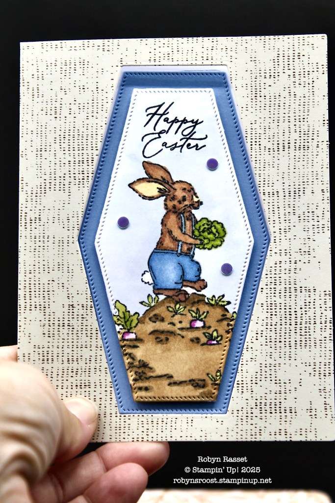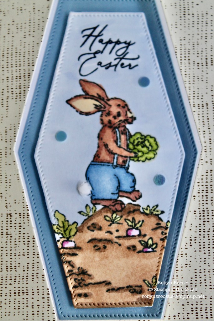 The bunny is from the Storybook Gardens stamp set and has been colored with Stampin’ Blend Markers.