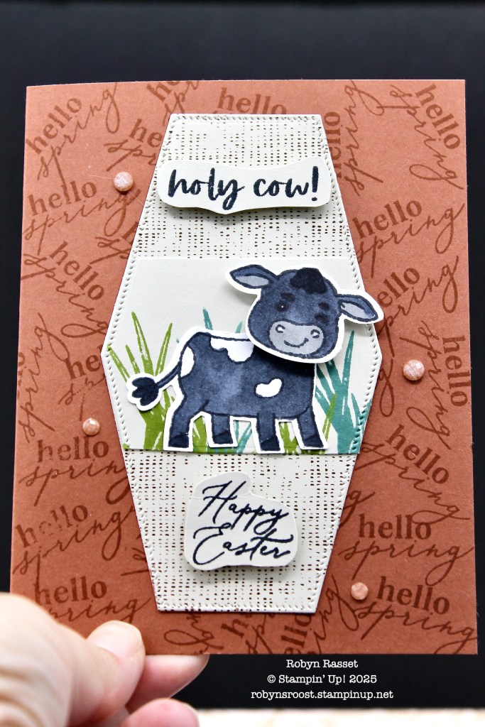 The holy cow greeting is from the Cutest Cows set, while the Happy Easter greeting is from the Hello Spring kit. Both are done on Basic Beige with Tuxedo Black ink, fussy cut, and popped up with dimensionals.