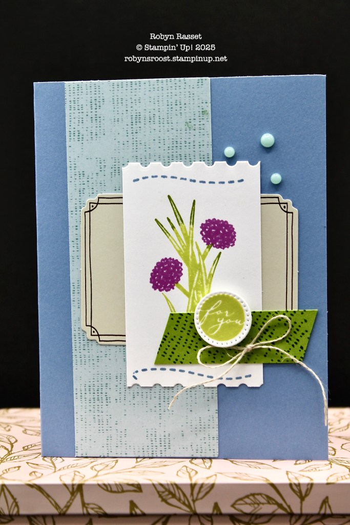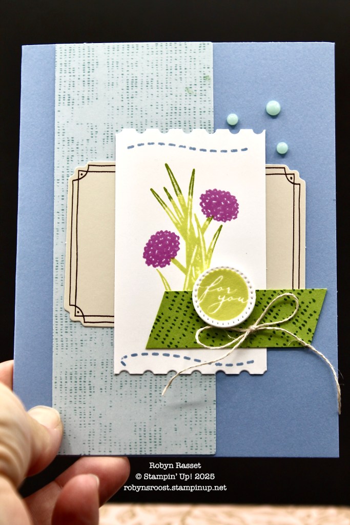 The chive greens were stamped first in Lemon Lime Twist and then the old Rock and Roll Technique was used to add Garden Green to the edges. The green strip is a piece of Granny Apple Green stamped with the background dots from the kit with Garden Green ink to look like the kit pieces which were all used up. The greeting is stamped with Lemon Lime ink and die cut with the smallest circle from the Stylish Shapes Dies. Again, a bow of Linen Thread was added using a glue dot to adhere. The gems are from the Dots for Days pack.