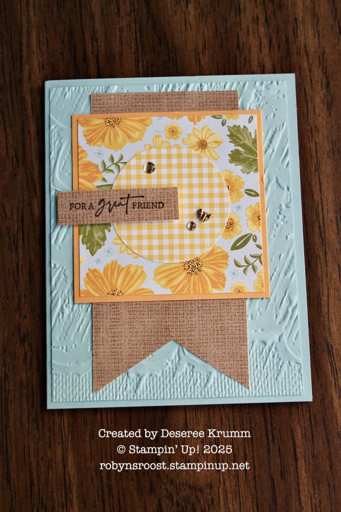 There is lots of texture on this card created by Deseree. First the Plaster Painting Embossing Folder adds texture then the three different designs of Floral Delight Designer Paper add more texture. A Tiny Bee Trinket and two Glossy Dots Embellishments finish off the card.