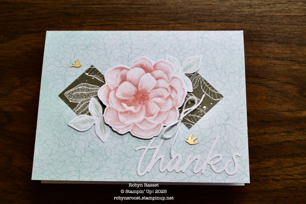 This card has a punch out word from the Say Something Pack with flowers and leaves which were left overs from a past Paper Pumpkin Kit. The little birds are from the Dragonflies and Birds pack and the squares are from the Nature’s Sweetness DSP.