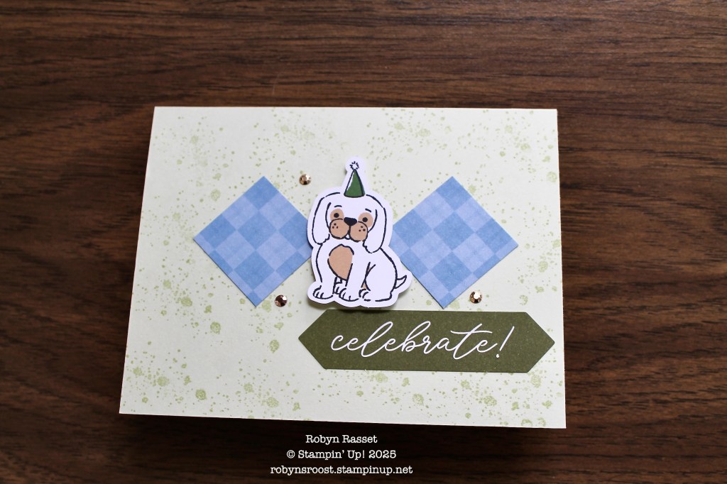 The star of this card is a cute little pup from the Something for Everything Ephemera Pack. The base is Soft Sea Foam with some soft Sea Foam splotches from the Elements of Text stamp set. The greeting is from the Birthday Treats Ephemera pack and it was finished off with 3 Metallic Gems. The little 1 1/4″ squares are from the Timeless Plaid DSP pack.
