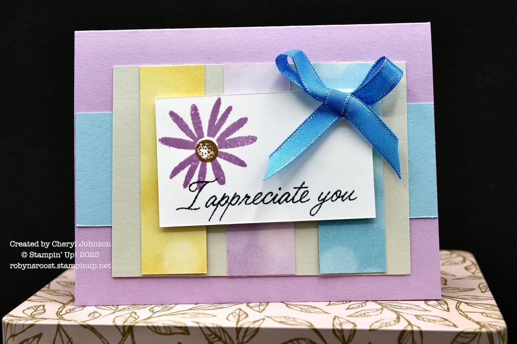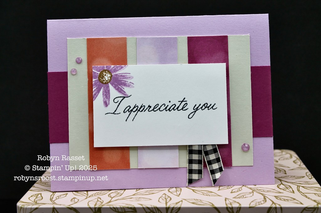 Both cards start with the same products and finish with different ribbons. The narrow designer paper strips are from the Beautiful Bokeh Designer Series Paper Pack.