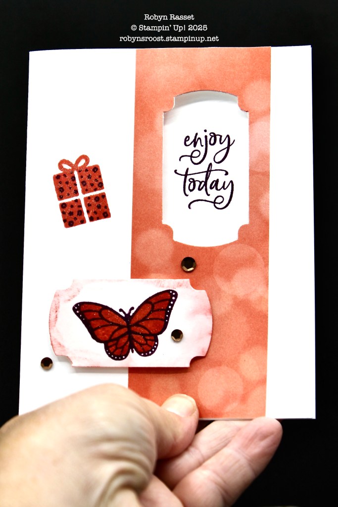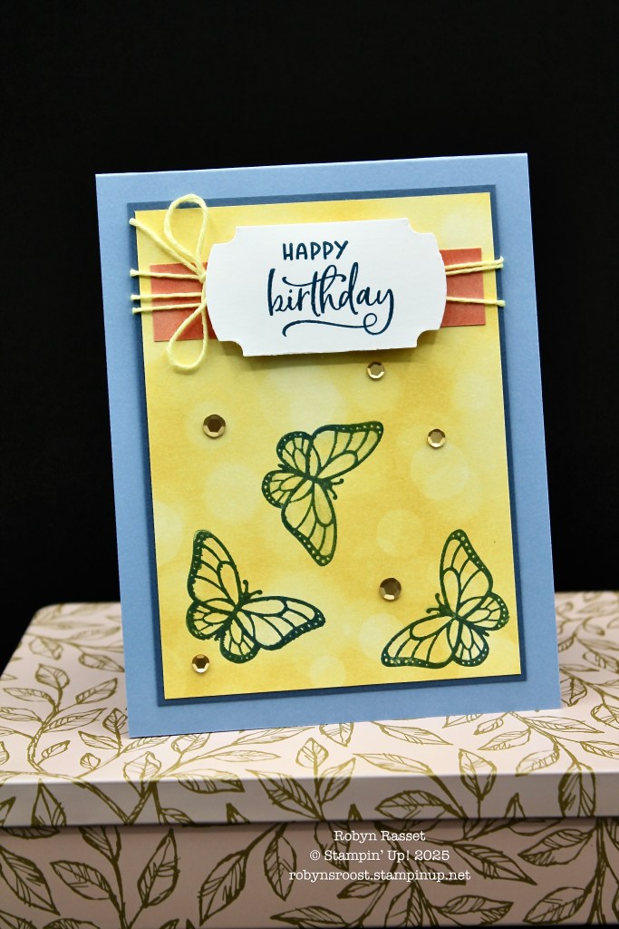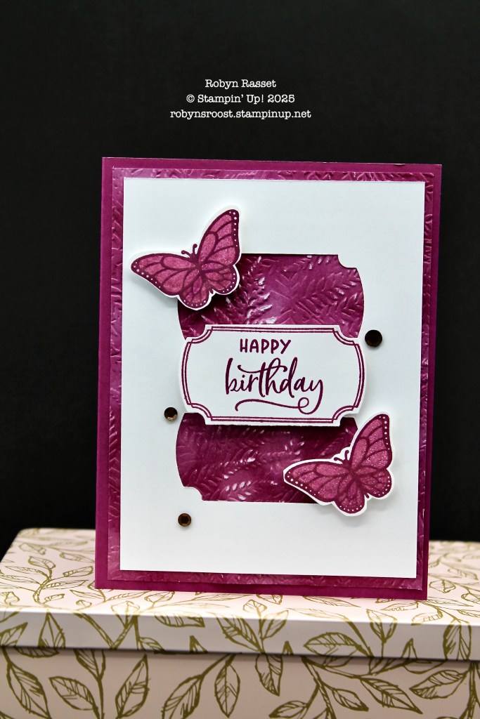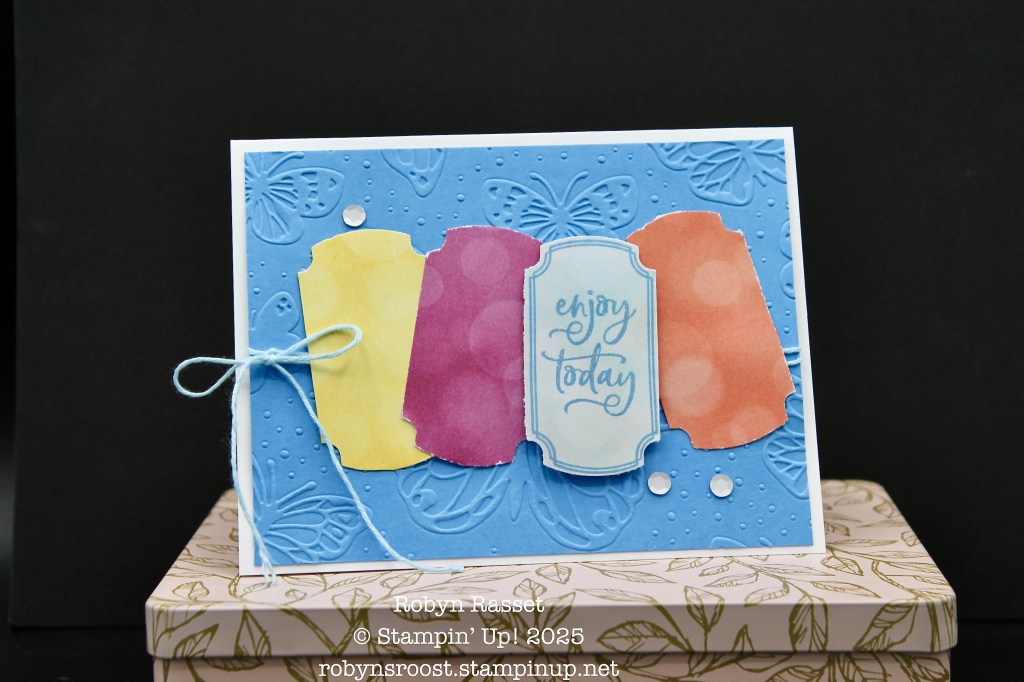 A layer which has been embossed with the Beautiful Butterflies Embossing Folders adds a calming background to the four labels punched from the Beautiful Bokeh Designer Paper.