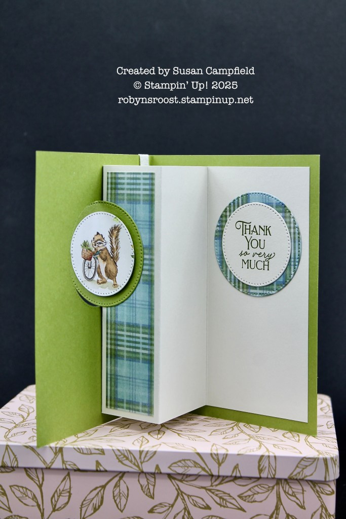 It features an inner tower piece which allows the little squirrel on the front to spin to be visible on the inside when the card is opened.