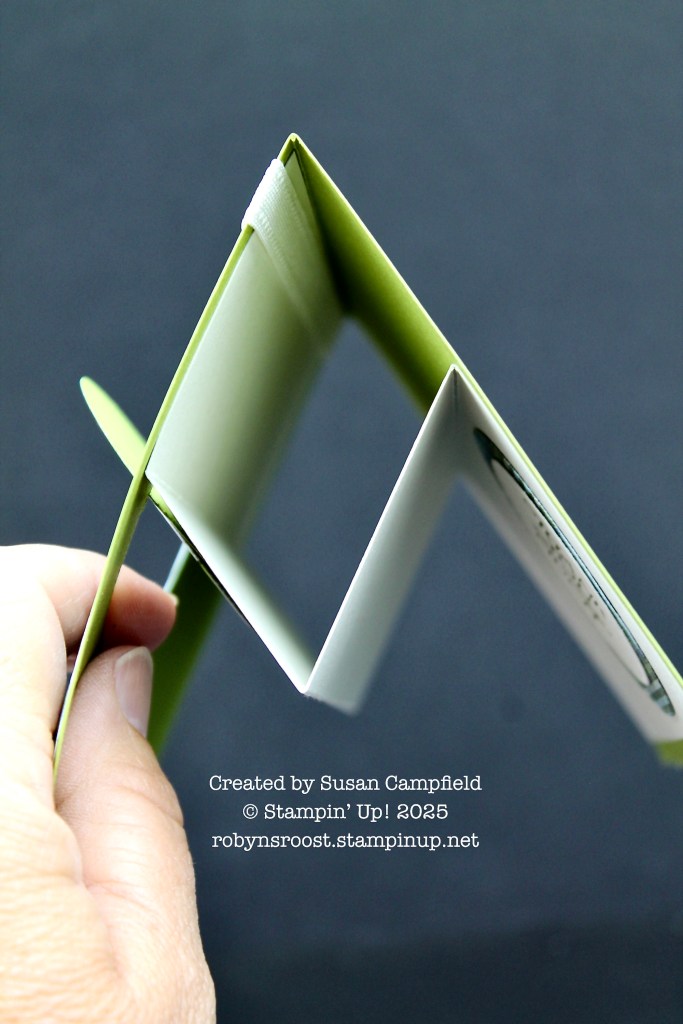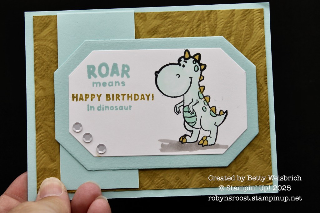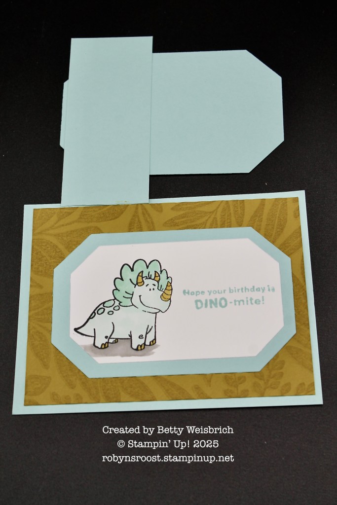 This cute card, created by Betty Weisbrich uses the Darling Dinos stamp set. At first glance, it looks like a regular card front, but the Dino flips up to reveal a second Dino friend.