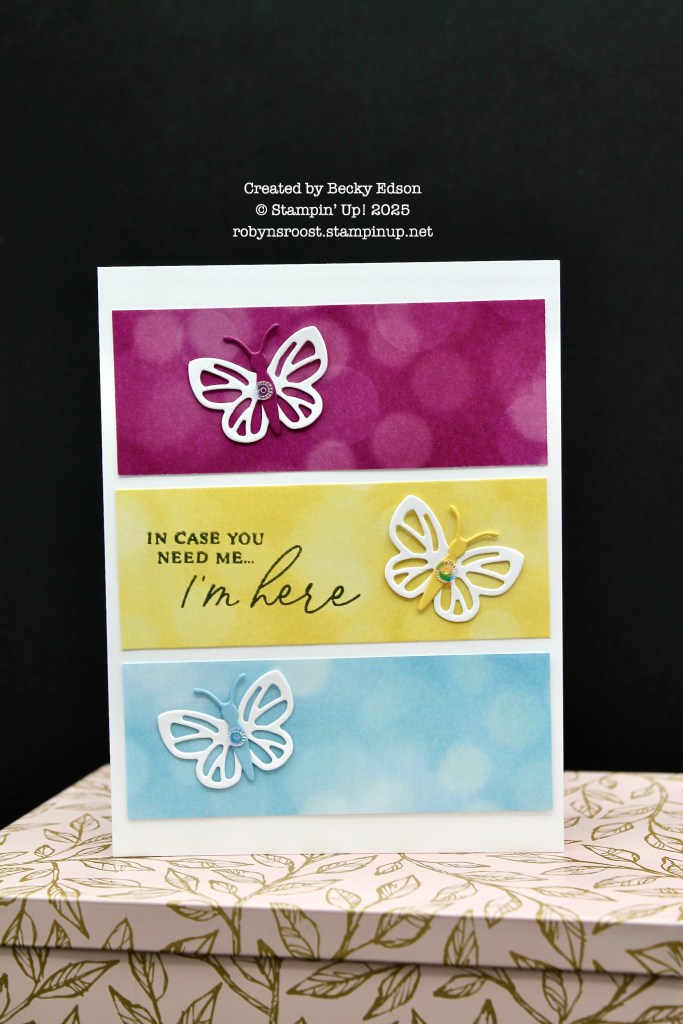 Next, is a very simple card by Becky Edson. Three 1 1/2″ x 4″ strips of the Beautiful Bokeh Designer Paper create pretty backgrounds for the little butterflies which have been created with the Beautiful Butterflies Dies.