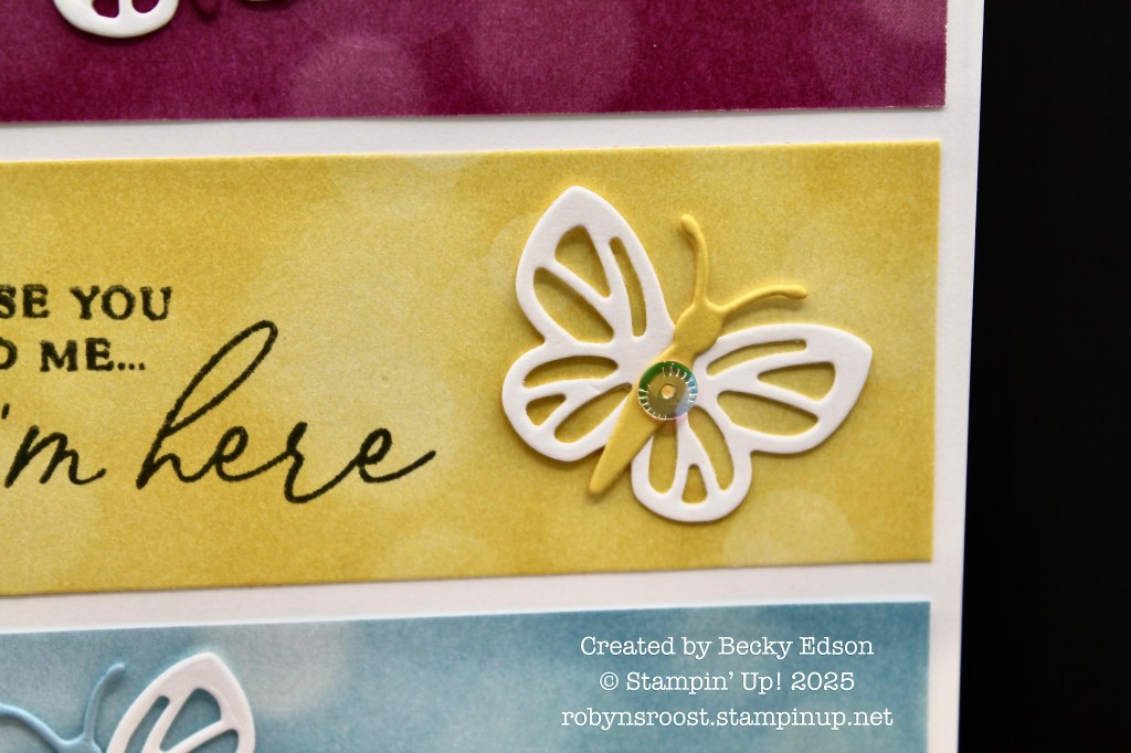 Each of the butterflies has one of the sequins from the Itty Bitty Bokeh Mix adhered to their bodies. The greeting is from the Beautiful Butterflies stamp set.