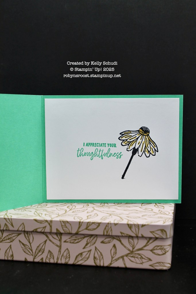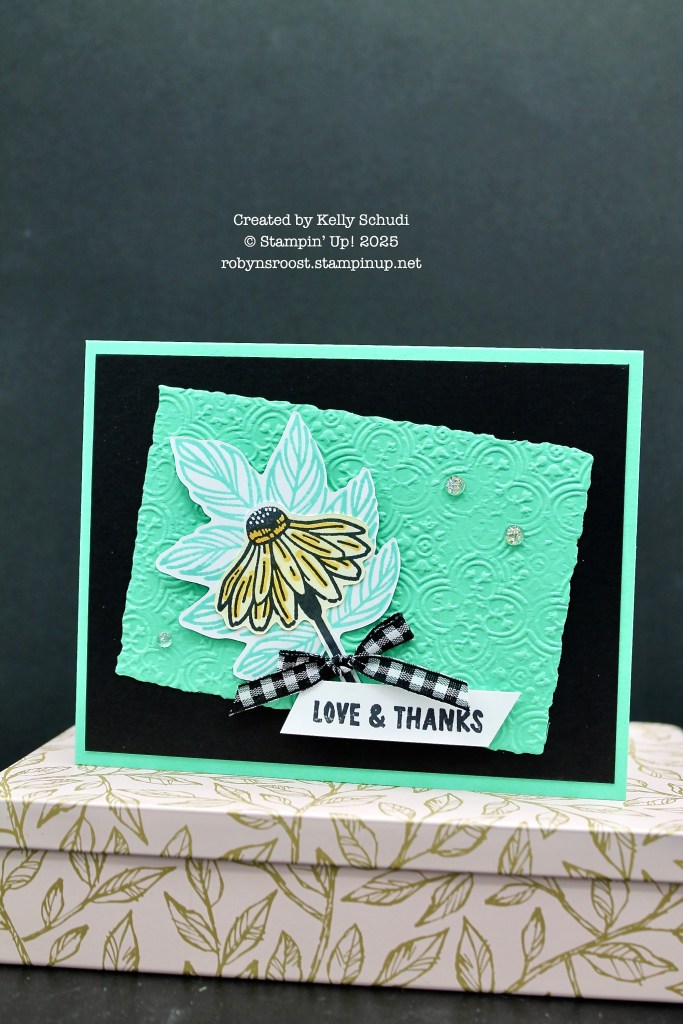 The color combo of Shy Shamrock, Basic Black and Basic White makes a striking contrast on this card created by Kelly. I like the way Kelly has angled the embossed layer, it gives the card some movement. Here are the products used on this card
