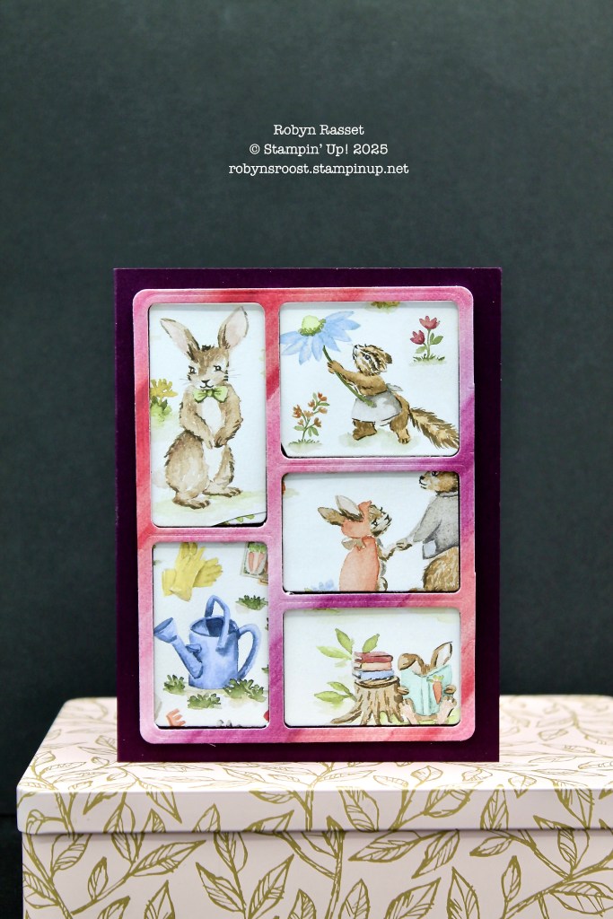 For this card, I started with a tackle box die cut of Full of Life Designer Series Paper. I cut off the hinge tabs from the sides. I used the same die to cut out pieces from the Storybook Moments Designer Series Paper. I was being frugal and using scraps, so the big rabbit on the left corner needed an extra slice to fill it in.