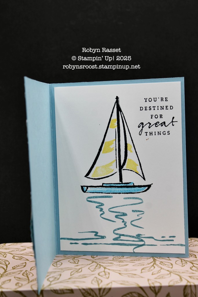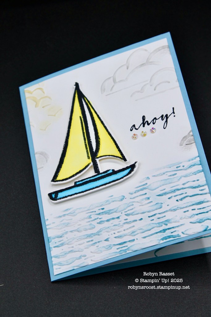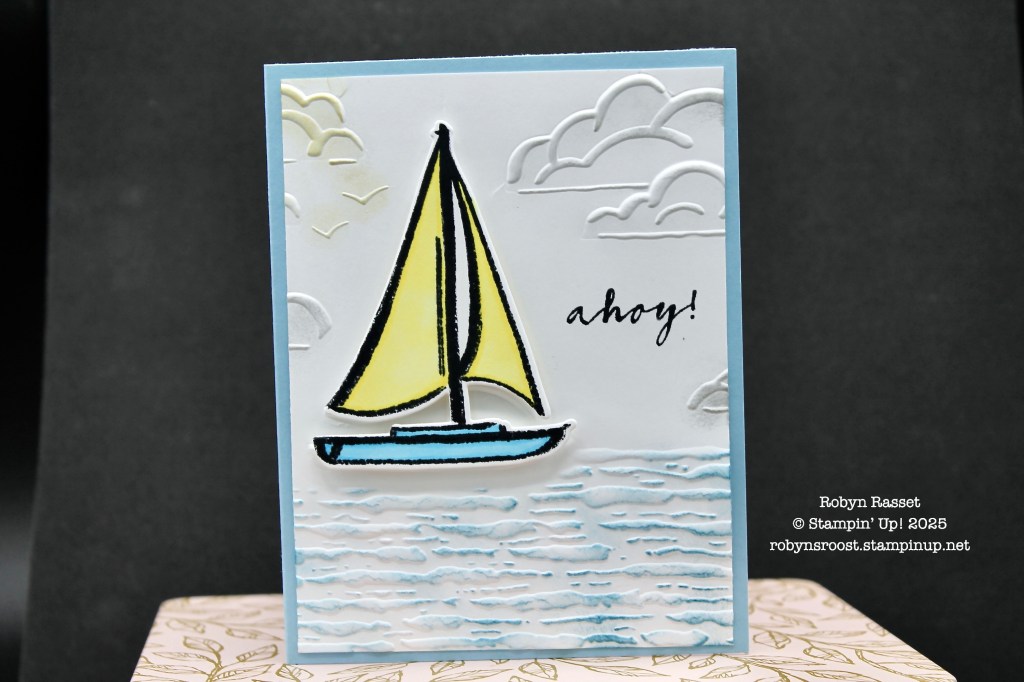 I’ve combined all three items for this card. The sailboat is stamped and colored with Stampin’ Blend Markers, then die cut. It is placed on top of the embossed sailboat on the embossed layer using dimensionals.