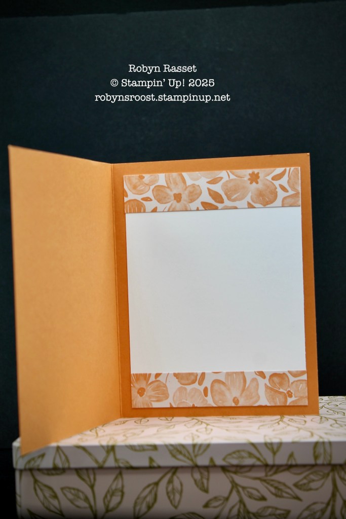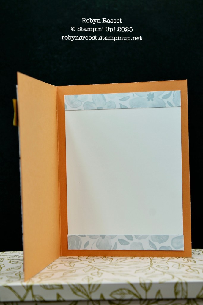 This card has a 3 3/4″ x 5″ piece of Basic White behind the strips. The greeting banner is die cut with a die from the Twisted in Time Die set. Crushed Curry ink was applied with a Blending Brush around the edges of the banner. The entire stamped image is popped up with dimensionals.