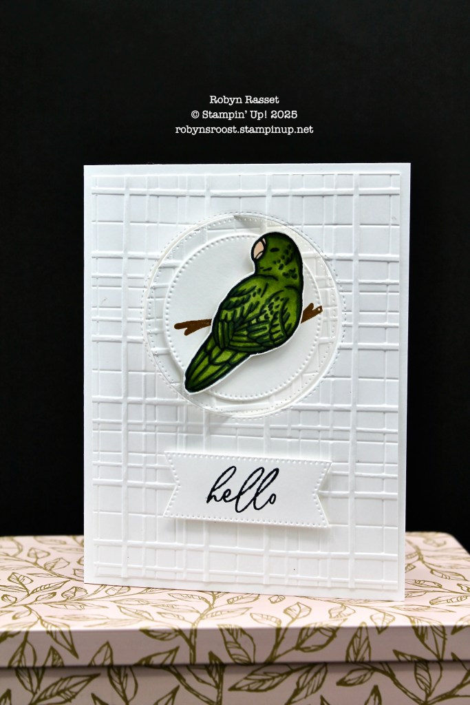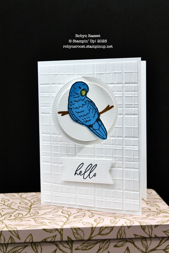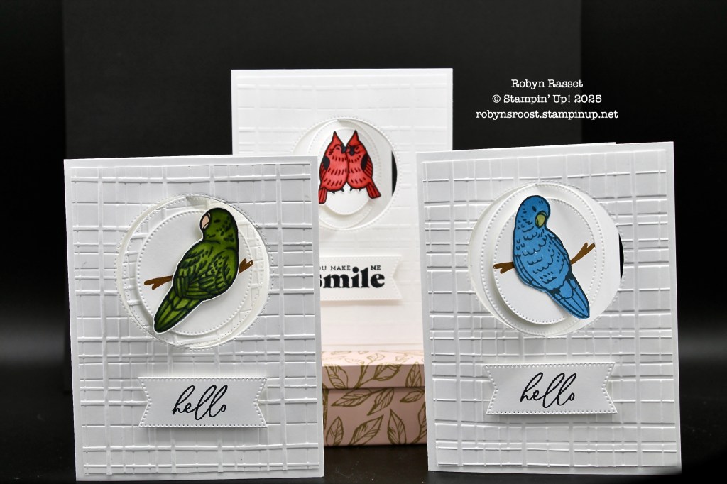 With a name like mine, I just have to love birds! The Feathered Fun stamp set was a must have for me. As a child I had a blue parakeet so I had to make a blue one, but I couldn’t stop there. The set also includes some cute sparrows and a set of snuggling cardinals.