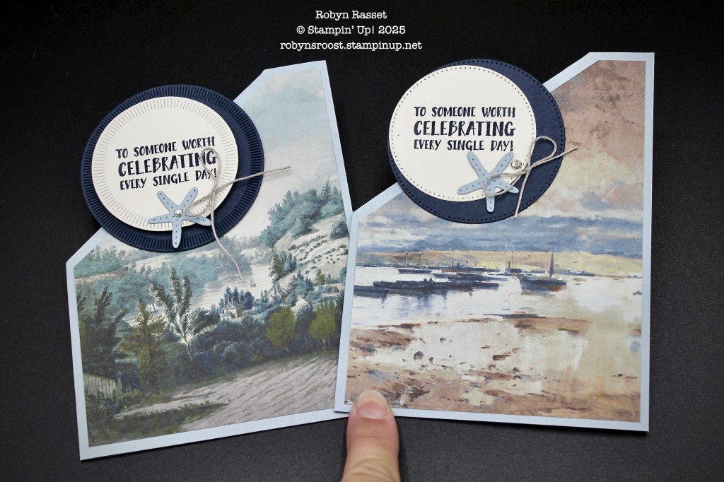 Both patterns have a water/boat theme. I did play with two different circle dies, Spotlight on Nature on the left and Stylish Shapes on the right.