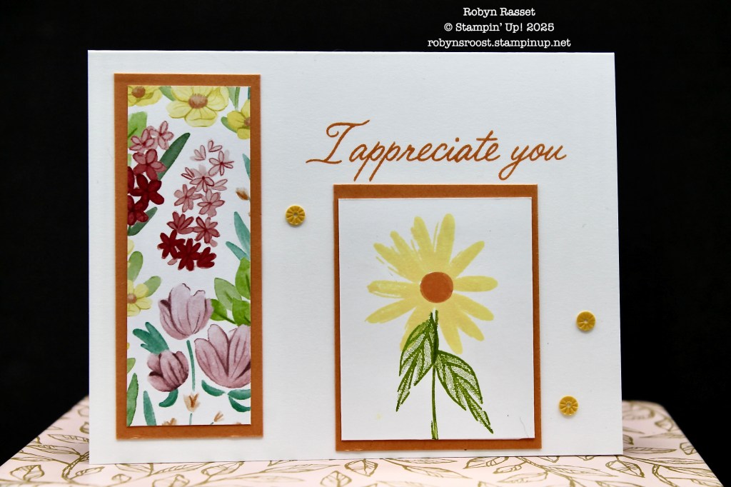 I chose the greeting from the Impressions Abloom stamp set because I truly do appreciate my customers taking the time and effort to come to my events! It’s a very simple to reproduce card layout and the element sizes can be adjusted to fit the image and greeting that are being used. We used Timid Tiger, one of the new 2025-2027 In Colors, for the ink and the matting. For this card the paper measurements are: