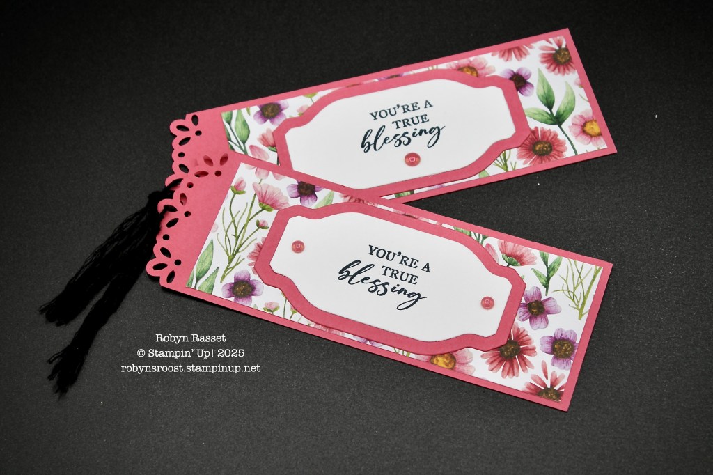 The bookmarks feature the luscious Strawberry Slush cardstock and Secret Sea ink. The tops are punched with the pretty Elegant Edge Tag Topper.