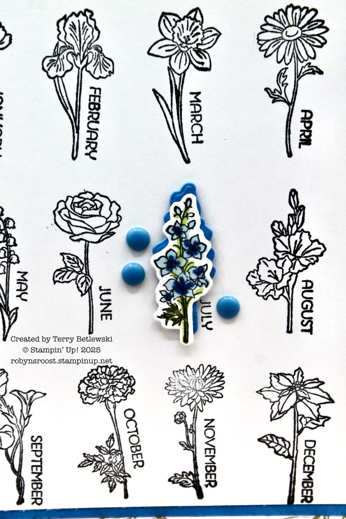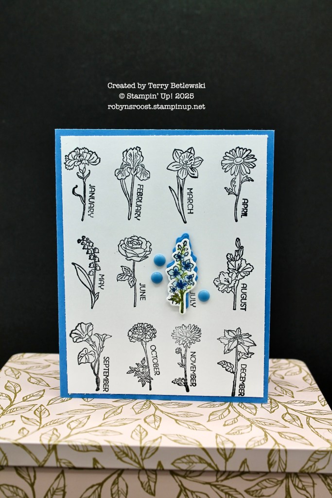 The card uses all 12 of the flowers in the stamp set. The month of July is highlighted with a colored and die cut flower with a shadowed matte layer.