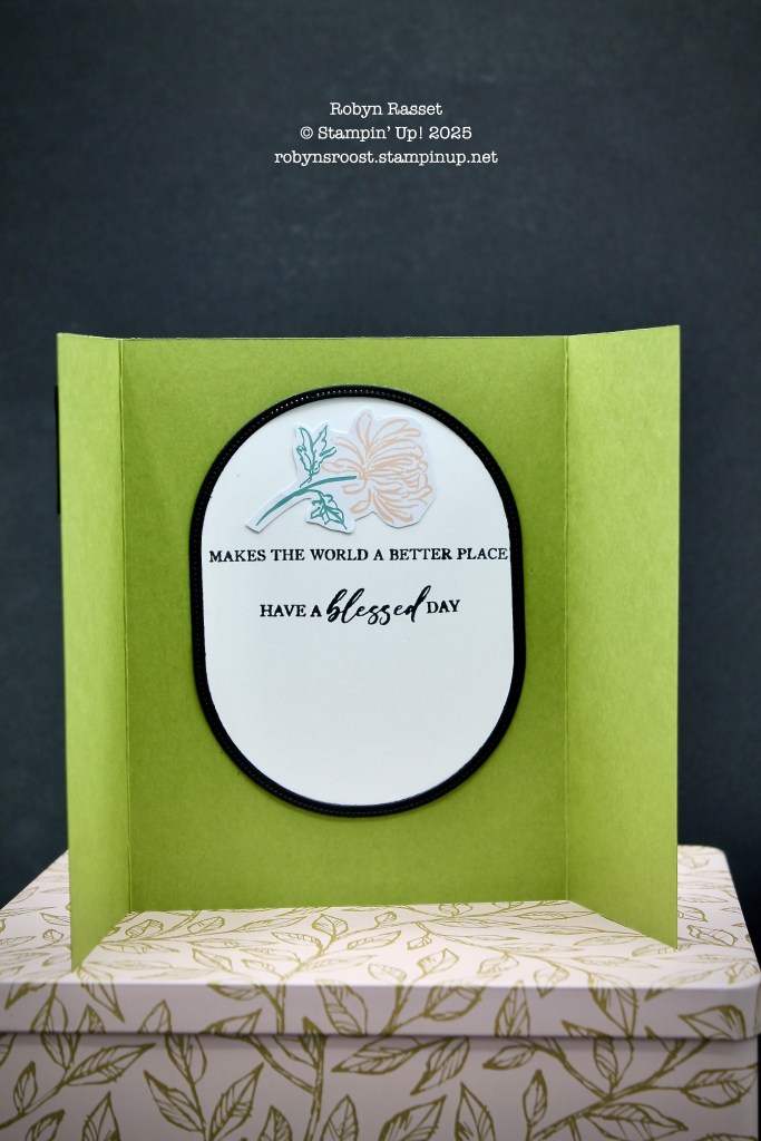 The card opens up to a greeting on a white oval with a black frame.
