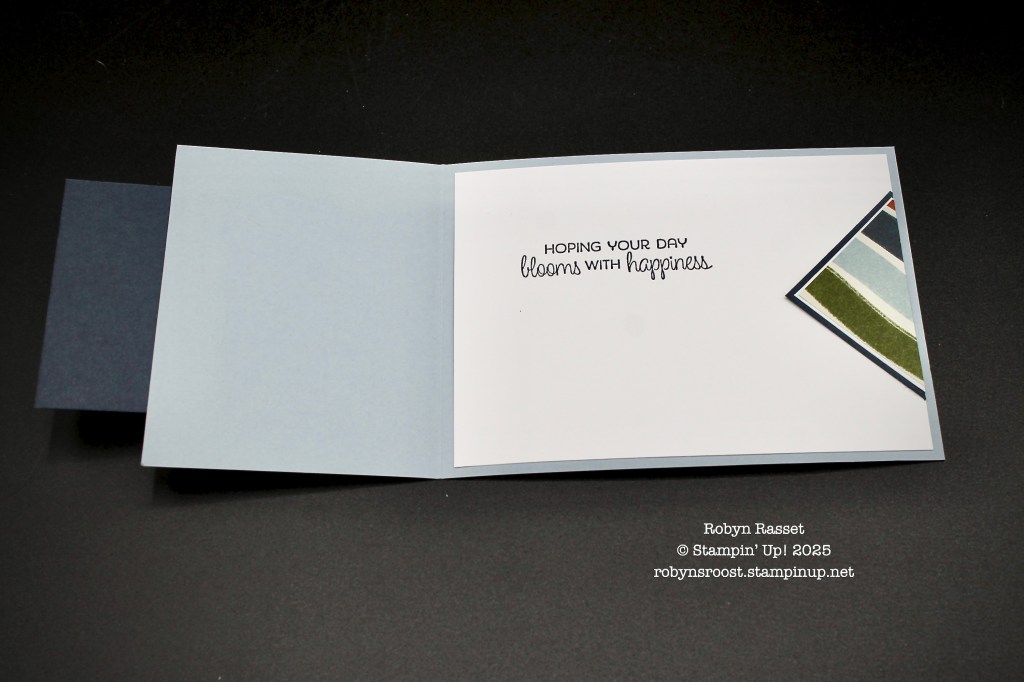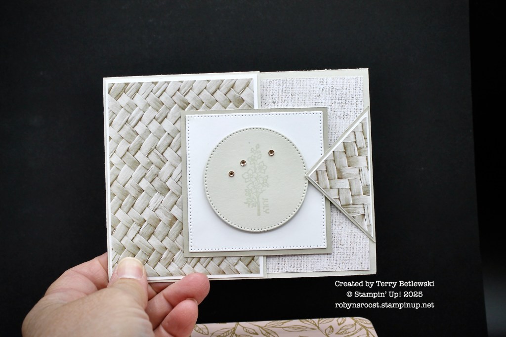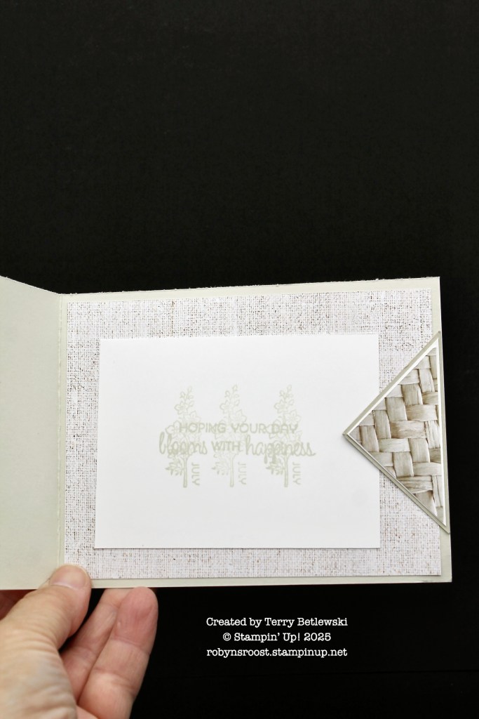 The inside of Terry’s card is a bit fancier than mine. She has a layer of the Need For Tweed Designer Series Paper and then a white greeting area. The latch on Terry’s card is also a bit fancier. She cut each triangle separately while I layered the squares and then cut the square diagonally. We both started with a 2″ base.