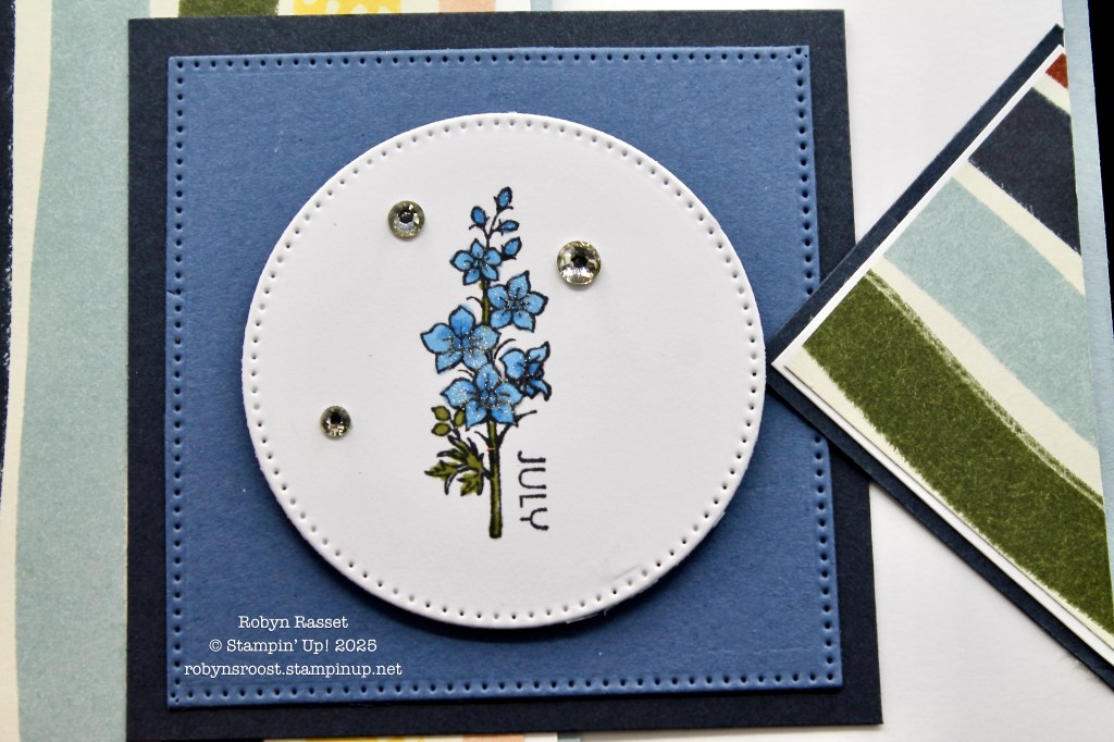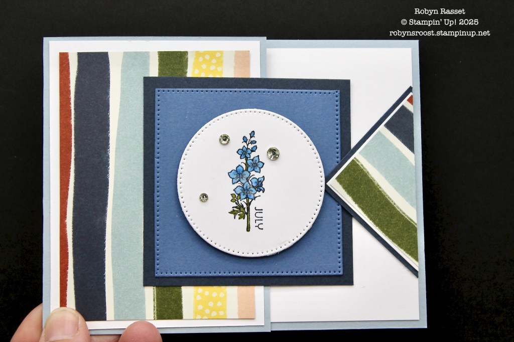 The focal image on both cards is a 2 1/8″ circle die cut from the Stylish Shapes Dies, layered onto a 2 3/4″ die cut square also from the Stylish Shapes Dies. The base layer for the focal image is a 3″ square. I’ve combined the Secret Sea In Color with Misty Moonlight, I really like this color combo!