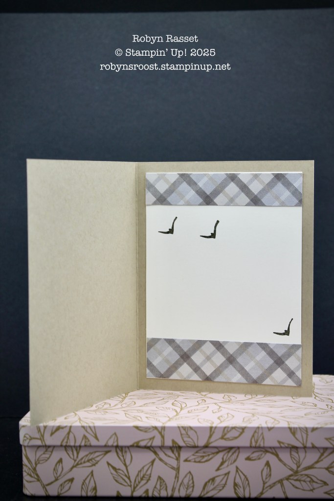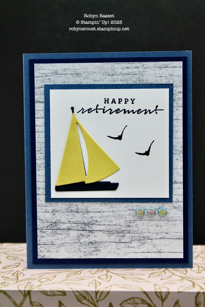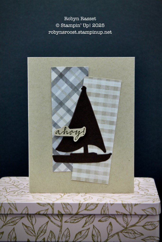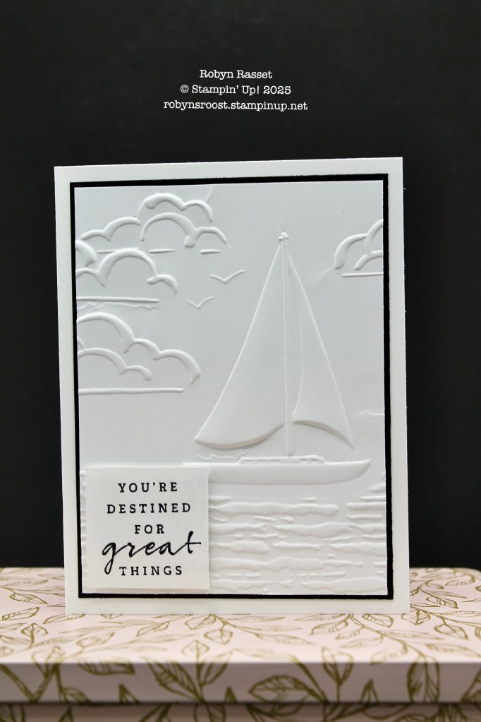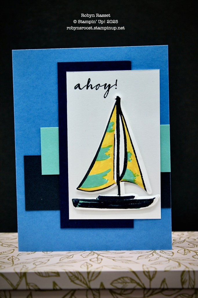 The card was created during a Mystery Stamping session and it almost stumped me, lol. The sailboat is stamped, embossed, and die cut. The Coastal Cabana stripes are stamped and then the Darling Duckling (yellow) part of the sail was colored in with a Stampin’ Blend Marker. A bit of Coastal Cabana was added to the boat with another Stampin’ Blend Marker.