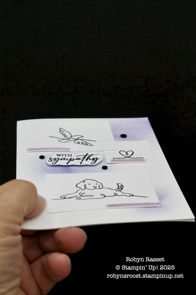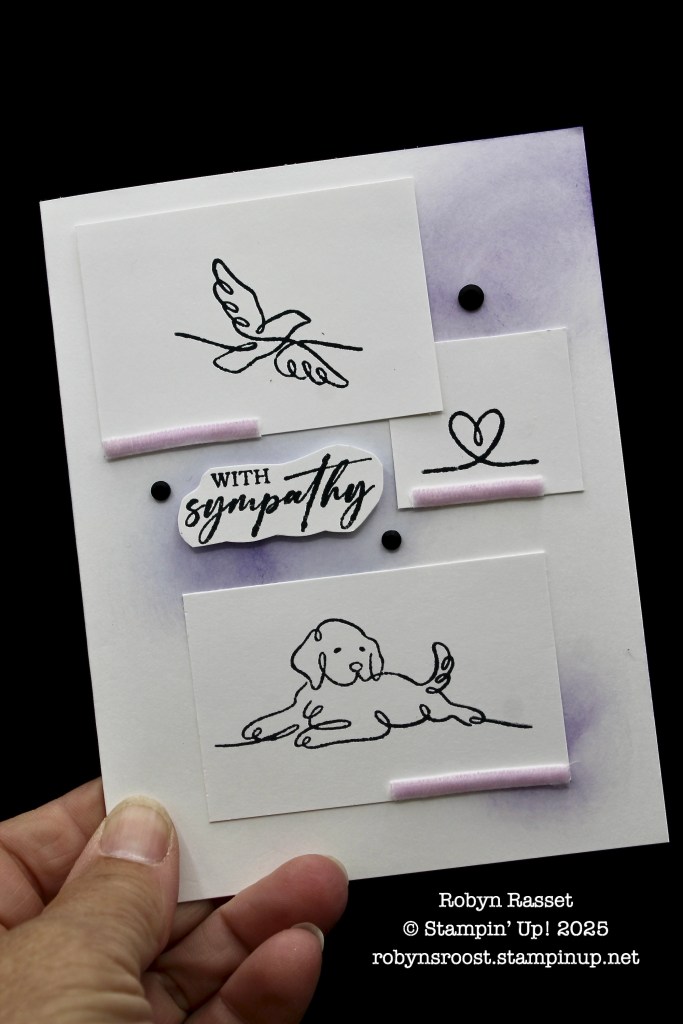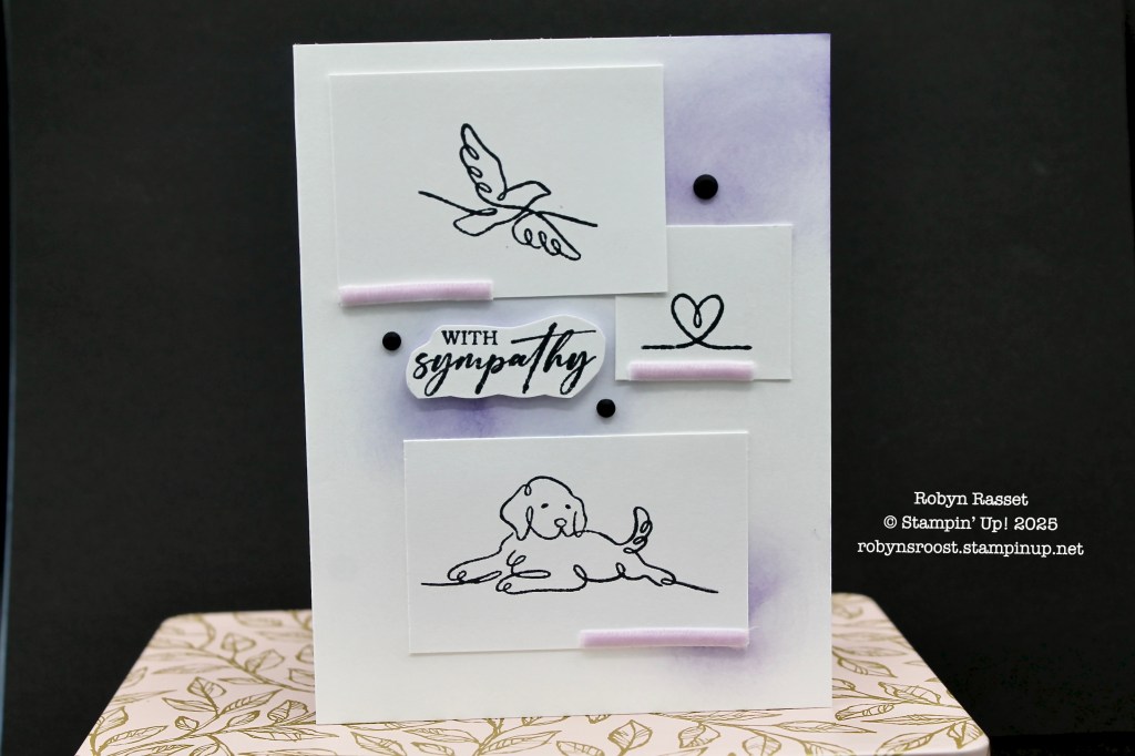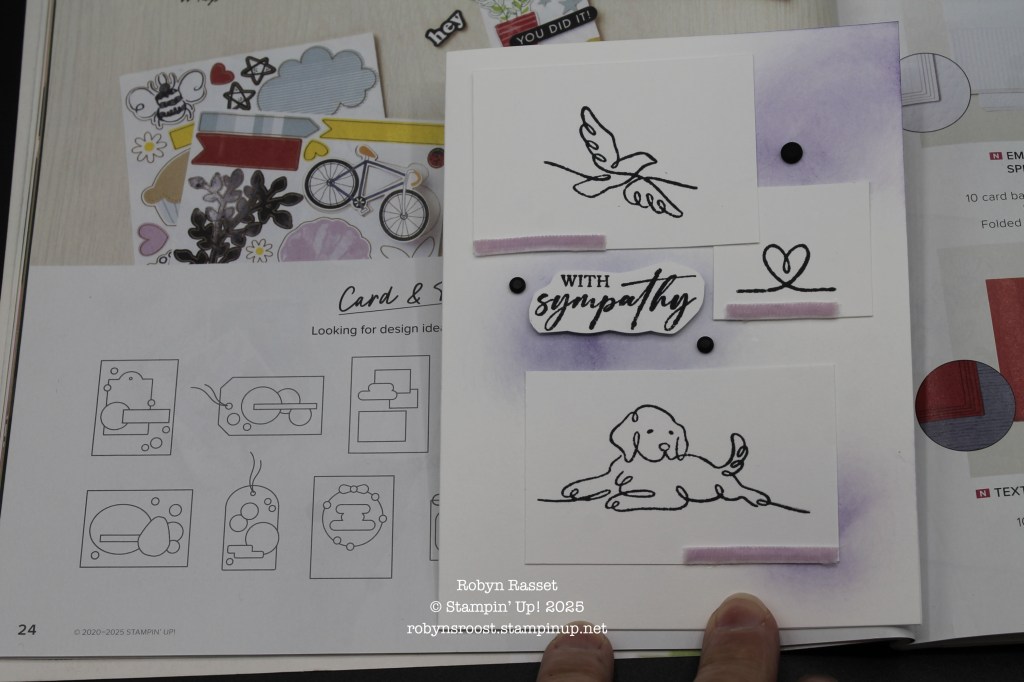 In my life, pets are family and I’ve missed sending a couple of pet sympathy cards because I didn’t have any in my box. Can you imagine? I have hundreds of cards in boxes and not the right one! So today I’ve created a simple pet sympathy card using the dog from the Along These Lines stamp set and a layout sketch from page 24 of the annual catalog.