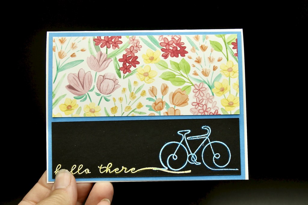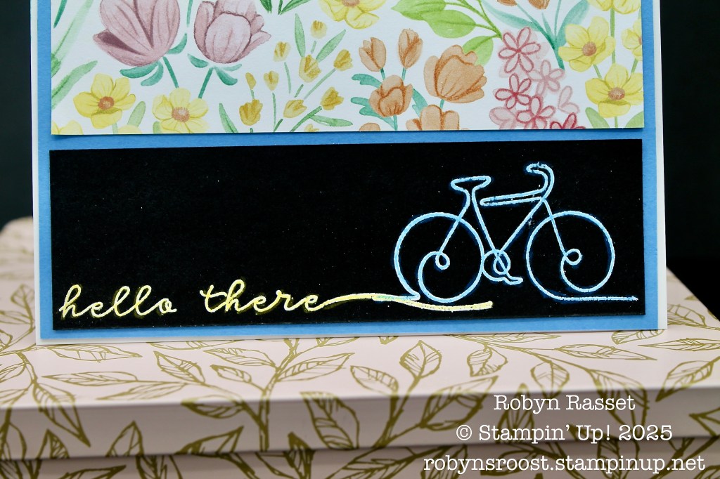 The bicycle image is from the cool Along These Lines stamp set while the greeting is from the Blooming Phrases. A match made in heaven or what?