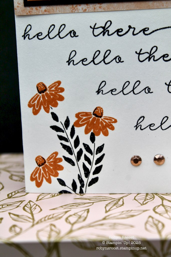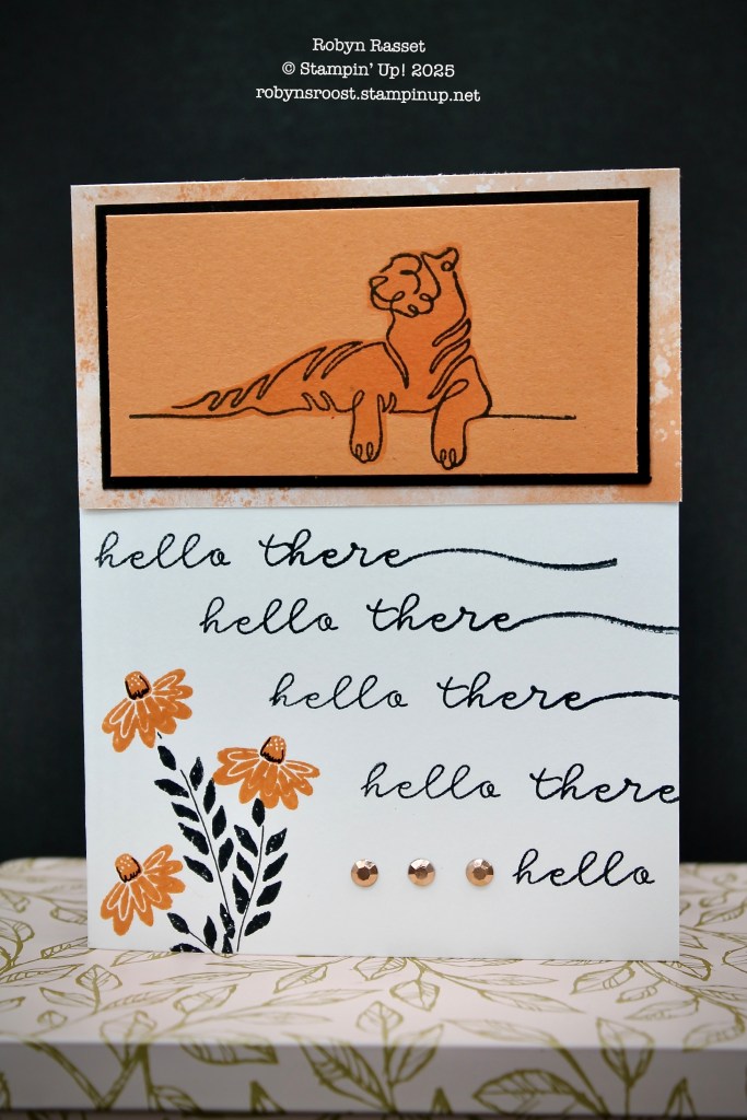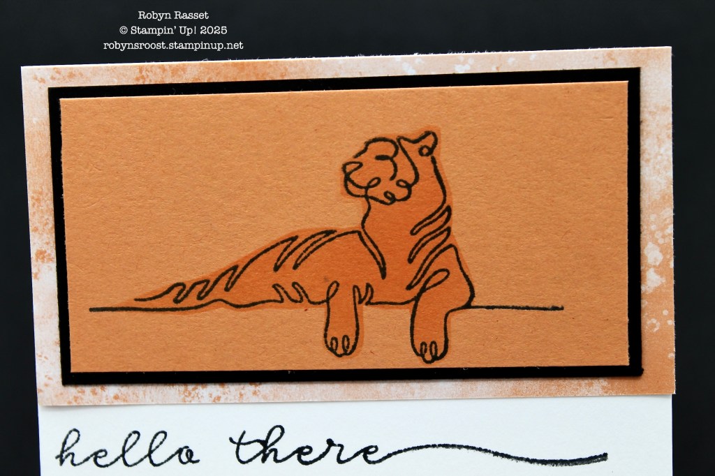 To make the tiger stand out, a Timid Tiger Stampin’ Blend Marker was used to loosely color in the image. The black matte really draws the eye to the lines which created the tiger. The mottled paper behind the tiger is the backside of one of the 2025-2027 In Color Designer Series Papers. I’m really loving the patterns on this DSP this year.