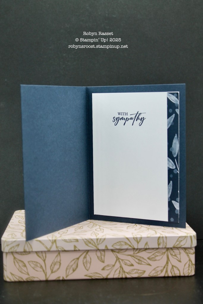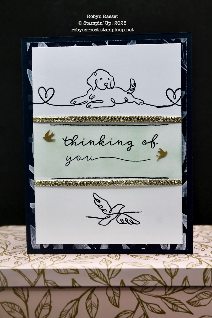 Next is a pet sympathy card. The words, again from the Blooming Phrases, have been highlighted using a Blending Brush and Soft Sea Foam ink. To add more emphasis twin strips of gold ribbon edge the words. The patterned paper behind the images is also from the 2025-2027 In Color DSP pack. The card base is Secret Sea, one of the 2025-2027 In Colors.