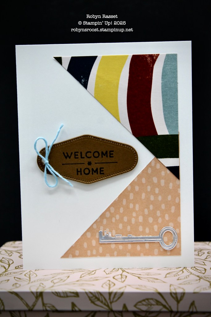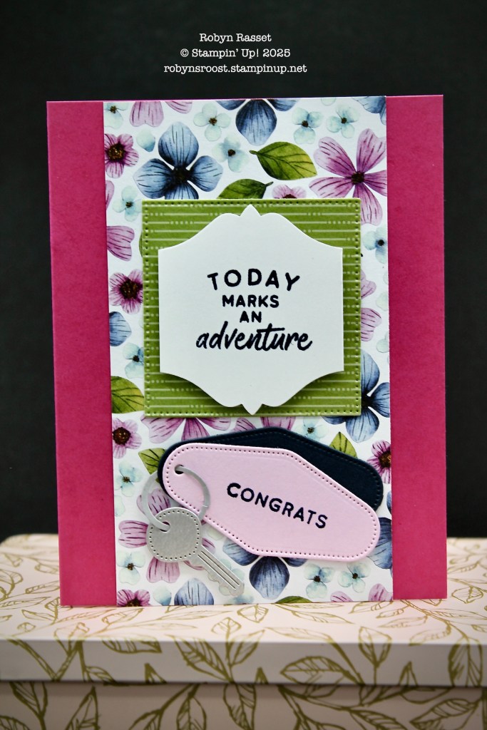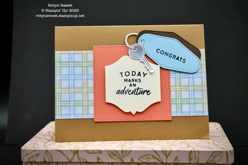 The ‘key ring’ was created with Smoky Slate cardstock by punching out a 5/8″ circle then punching again around the hole with a 3/4″ circle punch. A slot was cut to insert the key. The Calypso Coral stitched square is a die cut from the Stylish Shapes Dies and the greeting label is done with the To The Point Punch.