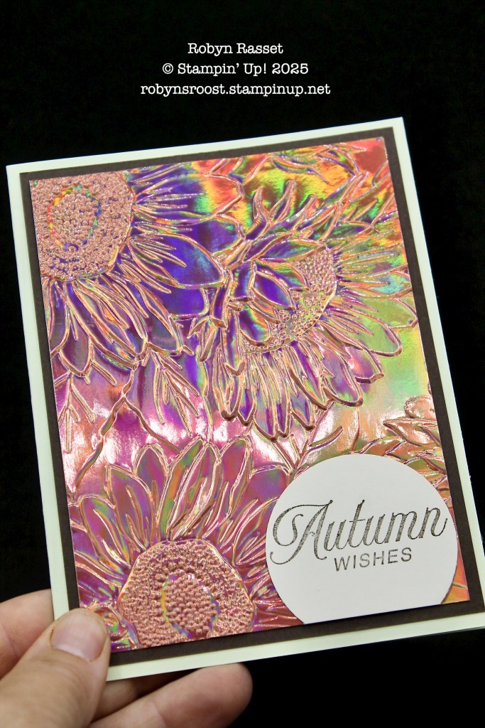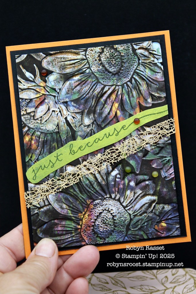This card uses the same inking the folder technique but is done on a piece of the Splendid Autumn Designer Series Paper. I love the way the colors glow.