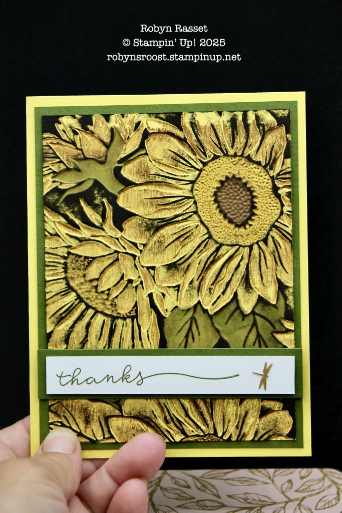 Here’s another example done with the Blooming Phrases stamp set and a little dragonfly from the Dragonflies and Birds Brass Embellishments. This card is trimmed with Mossy Meadow while the others were done with Early Espresso. The base is Darling Duckling (a new In Color) while the others were all Crushed Curry.