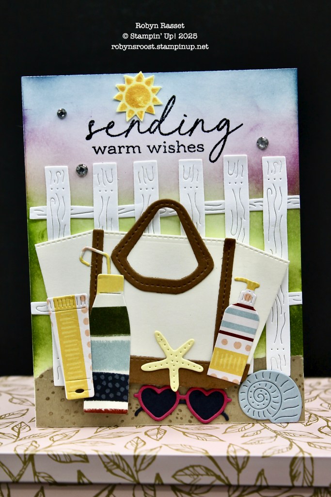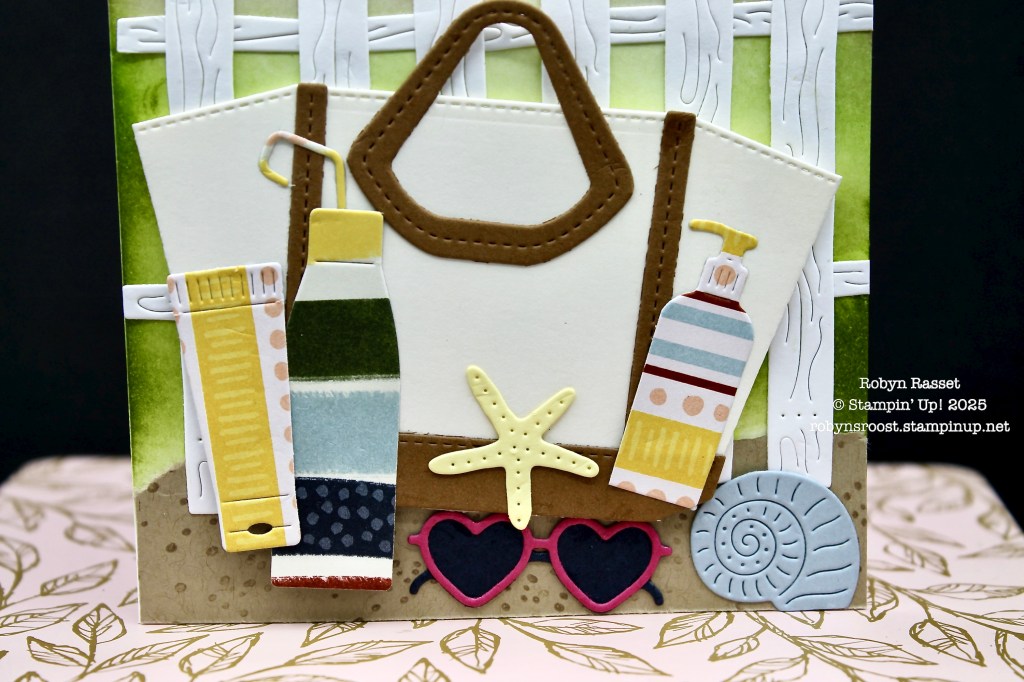 This card created with the Notes & Totes Bundle makes me think of those childhood memories. Although we didn’t have any fancy gear like this tote bag, lol. I remember how excited we would be as we got our suits on and threw our towels over our shoulder and packed grandma’s trunk with floats and toys. She had a big old Mercury with a window in the back that rolled down and we thought it was the most awesome thing in the world when she rolled it down for us, lol. Thinking back, I wonder how she felt about us wet sandy kids getting back into her nice clean car.