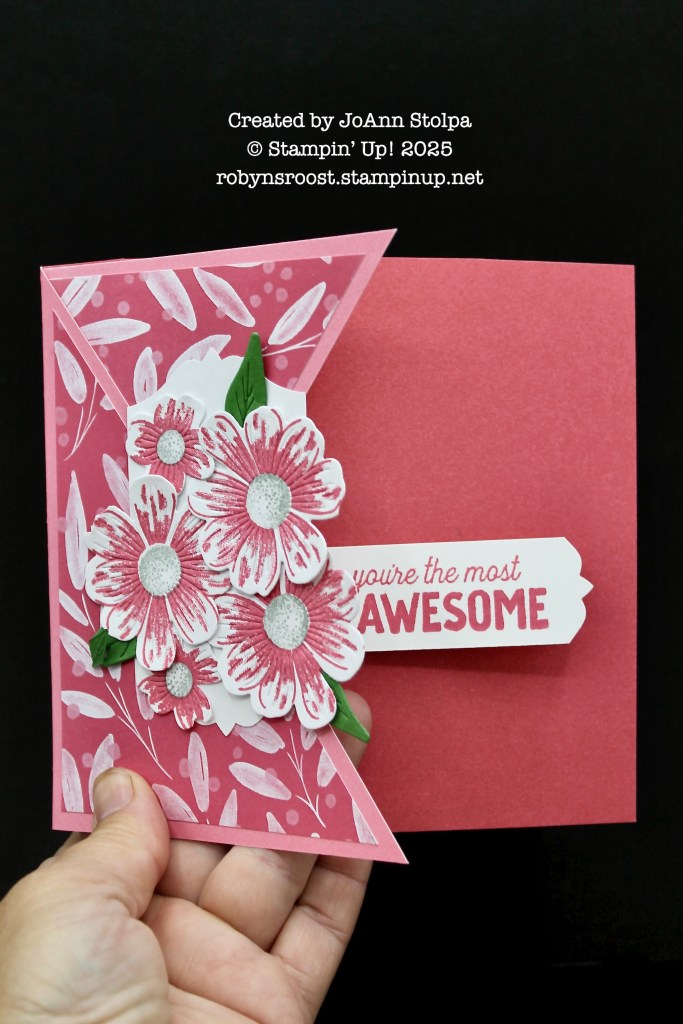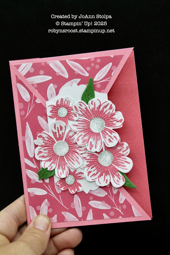 JoAnn’s card uses the Impressions Abloom Bundle for another fun diagonal fold. This card has the front cut off diagonally from the fold to the bottom tip and then the cut off piece is adhered to the inside creating a peek through V. The base is created with the Two Tone cardstock so there is a dark and light effect.