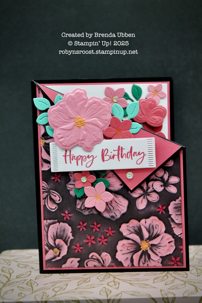 Brenda has created a corner fold card using the Happy Hibiscus Hybrid Embossing Folder and Dies. The greeting is from the Charming Days stamp set. The debossed side of the embossed layer is used and a Black ink pad is wiped across the surface to darken the background. The flowers are then colored with Stampin’ Blend Markers in Melon Mambo, Daffodil Delight and Pumpkin Pie.