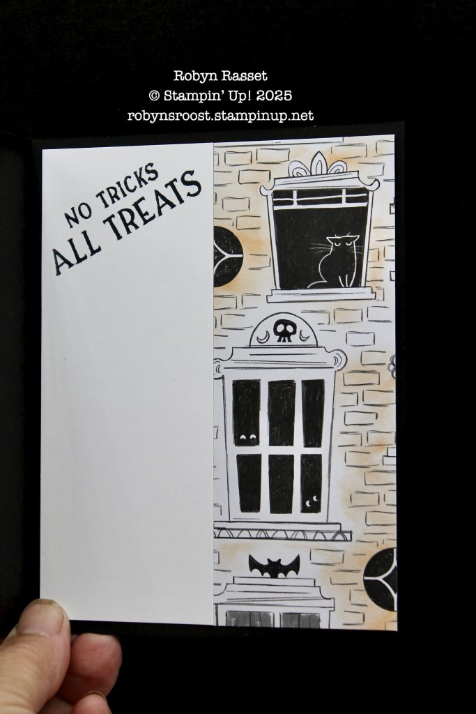 The inside is created with 2 strips that are 2″ x 5 1/4″. It might be easier to do a Basic White layer that is 4″ x 5 1/4″ and layer the Spooky Sweet DSP on that. (Hindsight)