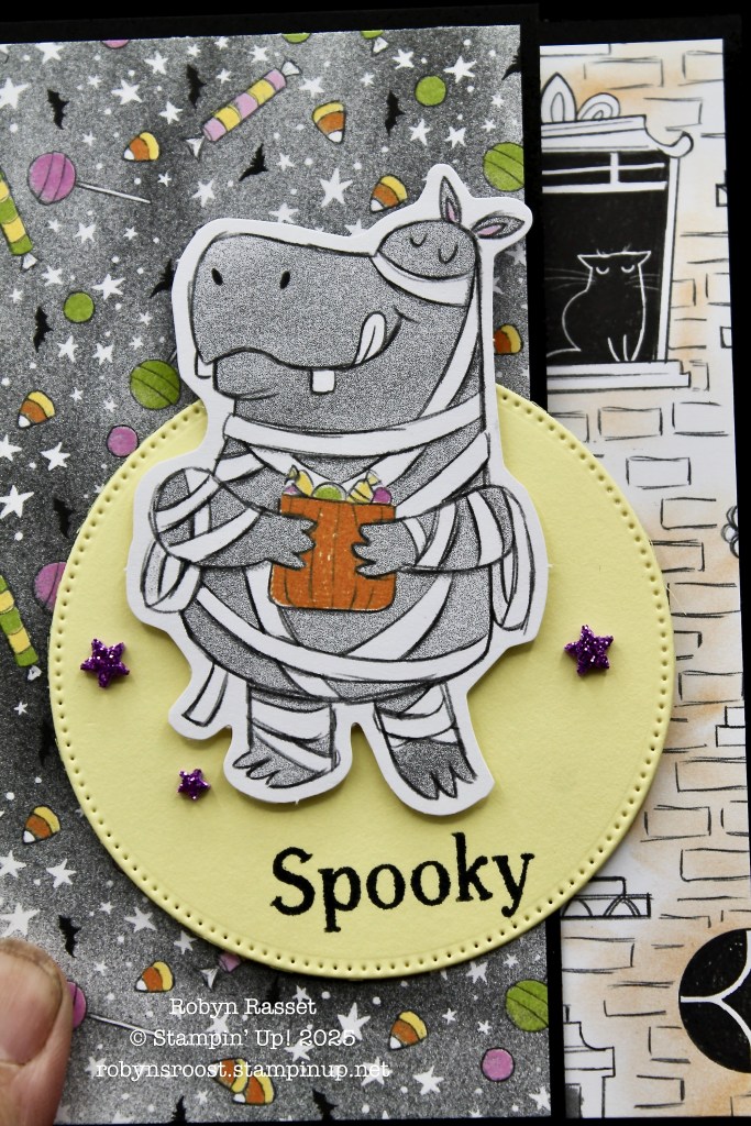 This cute hippo is a die cut from the Spooky Sweet DSP. There are 2 sheets with a whole bunch of fun Halloweeny images. The little Shimmer Foam Stars are also part of the Spooky Sweet Halloween Suite. The ‘moon’ is a Lemon Lolly Die cut from the Stylish Shapes Dies.
