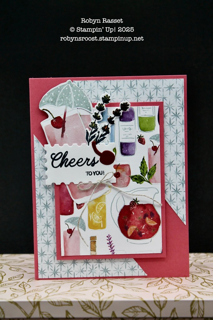The card features the Celebratory Sips Designer Series Paper and Cheers & Sips Bundle. I might have chosen a different pattern for the main image if I had known what we were going to do with it, lol. It is a bit busy. The greeting label is a die cut from the Perennial Post Die set (love that set!). The flower sprigs and cherry are die cuts from the Cheers & Sips Dies.