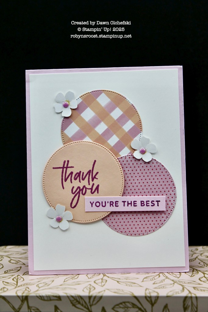 I LOVE this layout! So simple and so stunning. Classic Dawn! I can’t place the products that were used on this card except for the Stylish Shapes Dies for the circles but it’s so reproducible with ANY papers and stamps.
