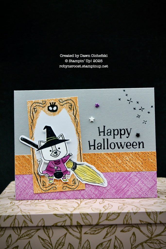 This card, also created by Dawn, features the Spooky Sweet Halloween Suite. It starts with a Smoky Slate base and all the other decorations are from the Spooky Sweet Designer Paper. Super Quick and Cute!