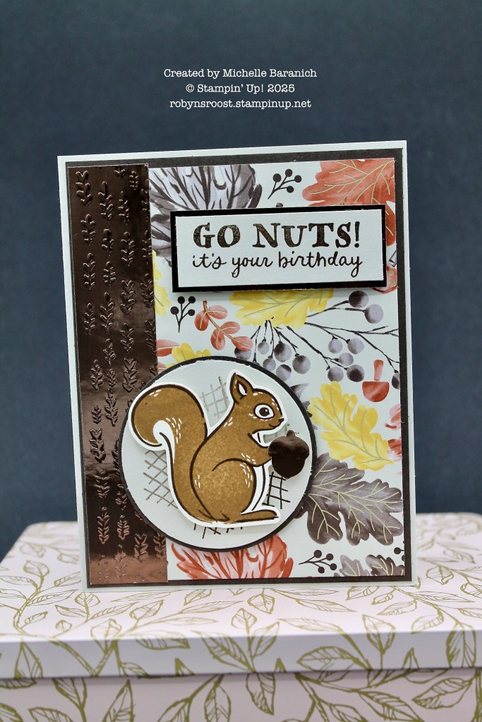 I love the embossed Earthen Toned Metallic Paper strip on the side on this card by Michelle Branch! The metallic paper is from the Autumn Toile Suite and the embossing folder is from the Gathering Together Suite. These two suites pair beautifully together, and with the Fluffy Squirrel Bundle. The Gathering Together Designer Series paper has foil accents (the veins on the leaves are foil).
