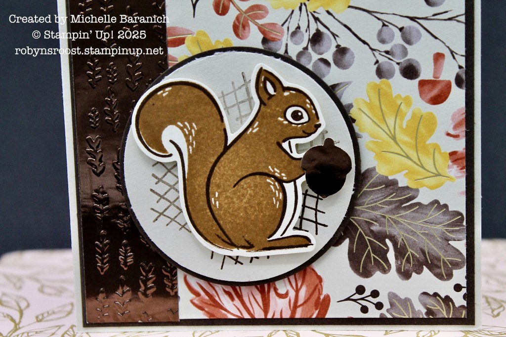 The Fluffy Squirrel stamp set has a matching punch which can be purchased together as a bundle for 10% savings. The little acorn is also included on the punch. The squirrel is popped up with deminsionals on a 2 3/8″ punched circle of Basic Beige. The Early Expresso circle is 2 1/2″ and I’m not sure which die set that is from.