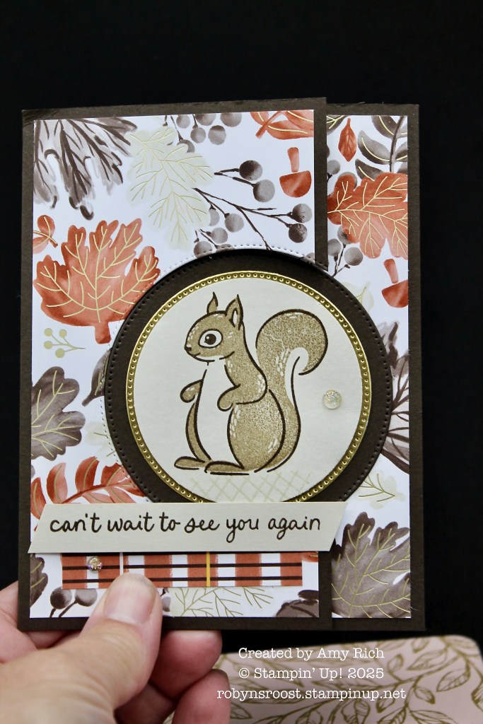 This Fun Fold by Amy Rich features many of the same products as Michelle’s card. She has teamed the squirrel up with some gold foil and stamped him in Crumb Cake ink to match. Instead of punching the squirrel out Amy has stamped him on a punch 1 7/8″ circle.