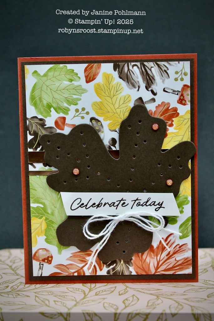 The first card from Janine Pohlmann uses the maple leaf die from the Gathering Moments set. Here you can see the holes without any stitching. So it works well both ways. She has it teamed up with the Gathering Together Designer Series Paper and the Cajun Craze & Gold Dots, with a double white Baker’s Twine bow.