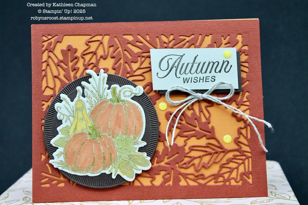 The next card, created by Kathleen Chapman, features the Amber Autumn Bundle. The pretty leaf die cut on the front is cut on a piece of Cajun Craze paper that is 5 1/2″ x 4 1/4″ to perfectly cover the front of the Pumpkin Pie card base.
