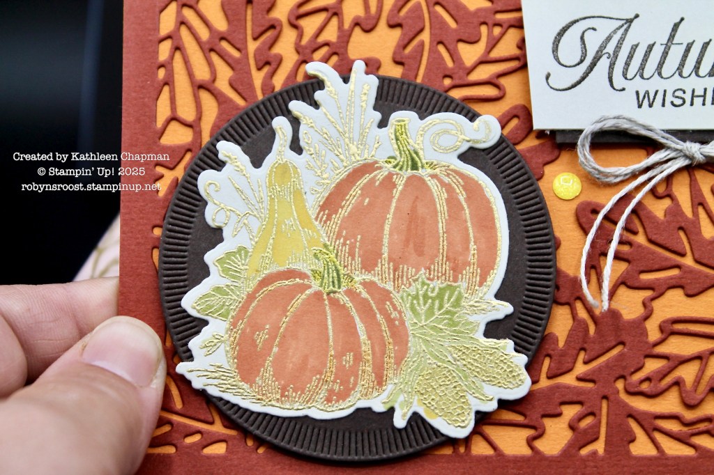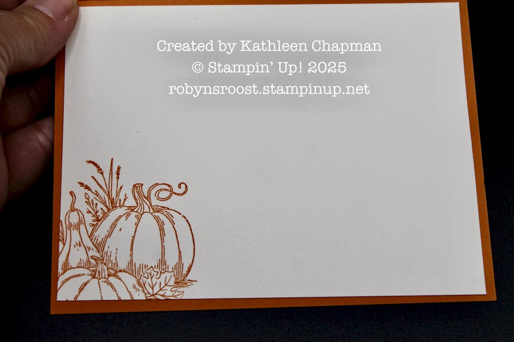 Inside Kathleen has stamped the pumpkin image again using Pumpkin Pie ink and let it run off the corner. I love both of these cards!